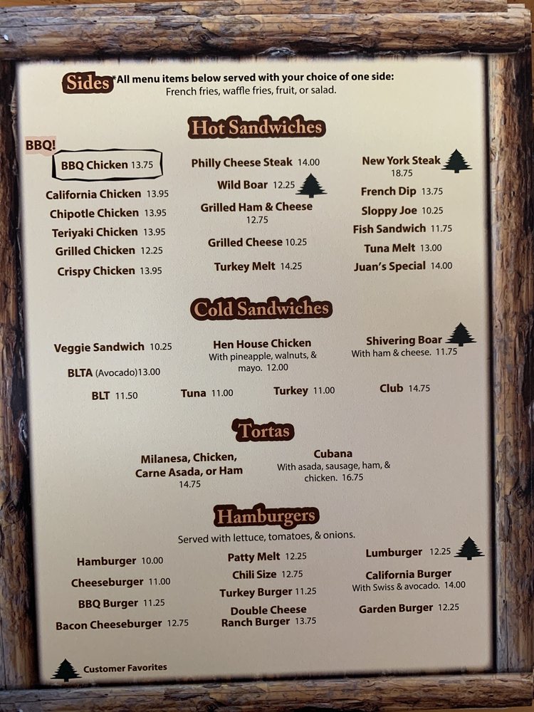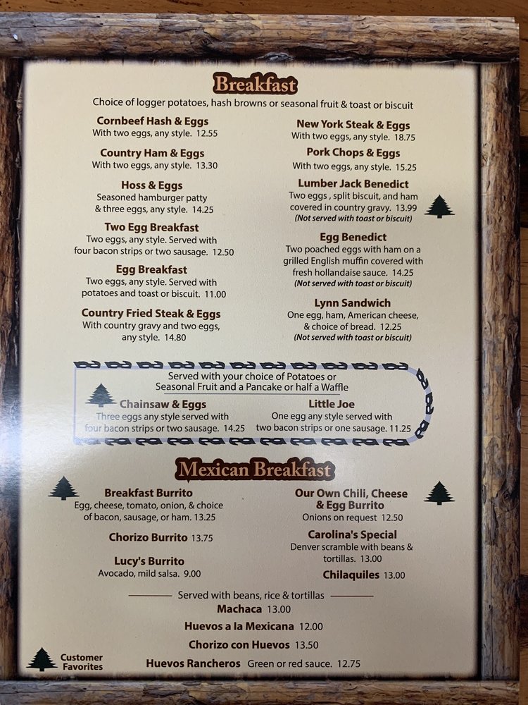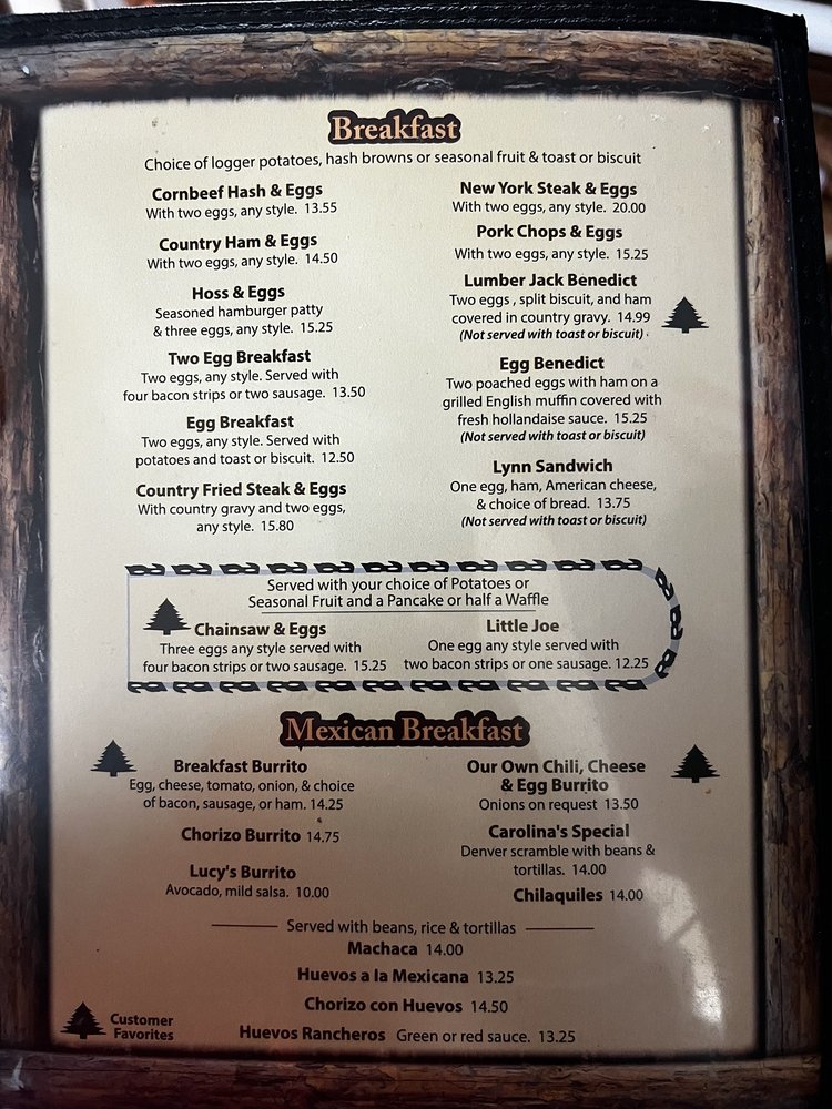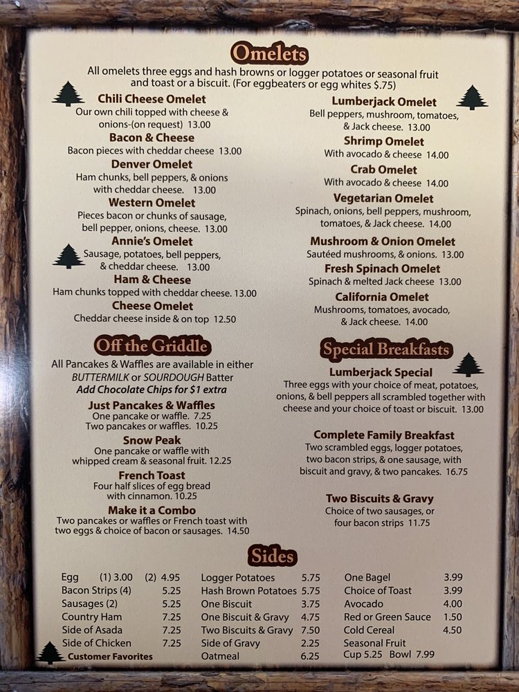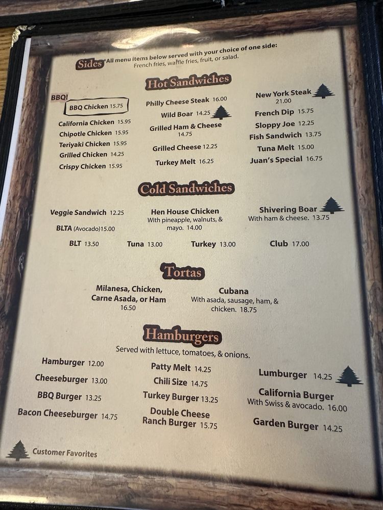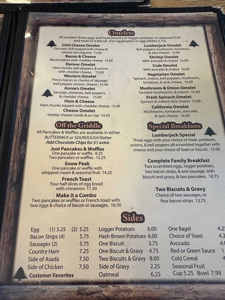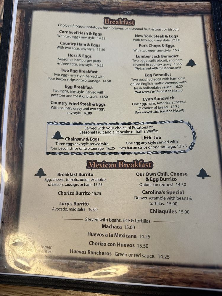 Introducing the menu at Lumberjack Cafe, a quaint spot in Big Bear City, CA, offering a selection of mouthwatering dishes in the categories of desserts, breakfast & brunch, and sandwiches. With reviews praising their chicken fried steak with flavorful Lumberjack potatoes and steak chilaquiles that are to die for, this family-owned cafe is known for its large portions and friendly service. The rustic yet cozy atmosphere, along with quick and delicious food options like Hollandaise sauce on scrambled eggs Benedict, make it a must-visit spot for a satisfying meal. While some customers have noted longer wait times on busy days, the overall consensus is that Lumberjack Cafe is a go-to destination for a hearty and satisfying dining experience.